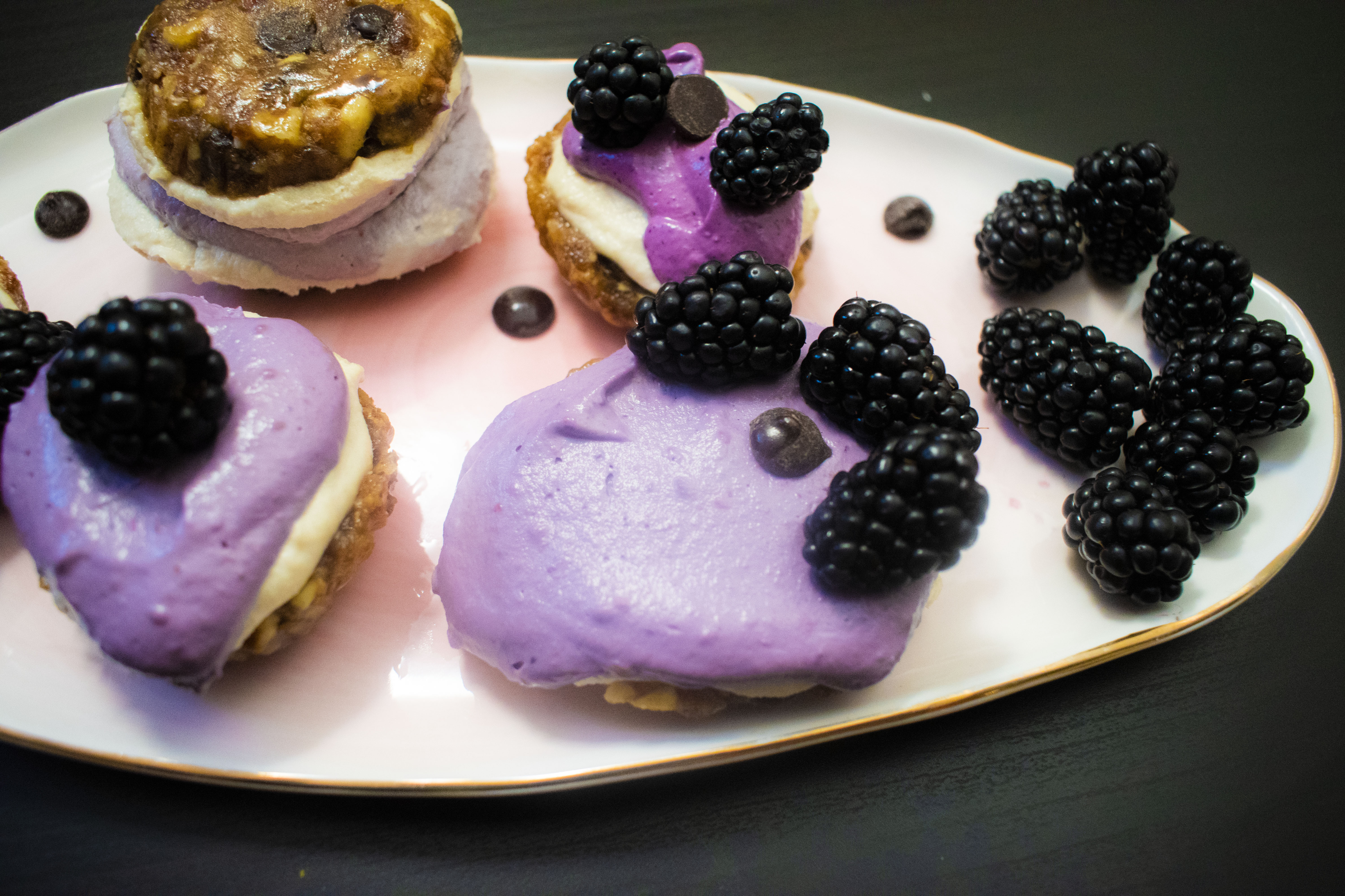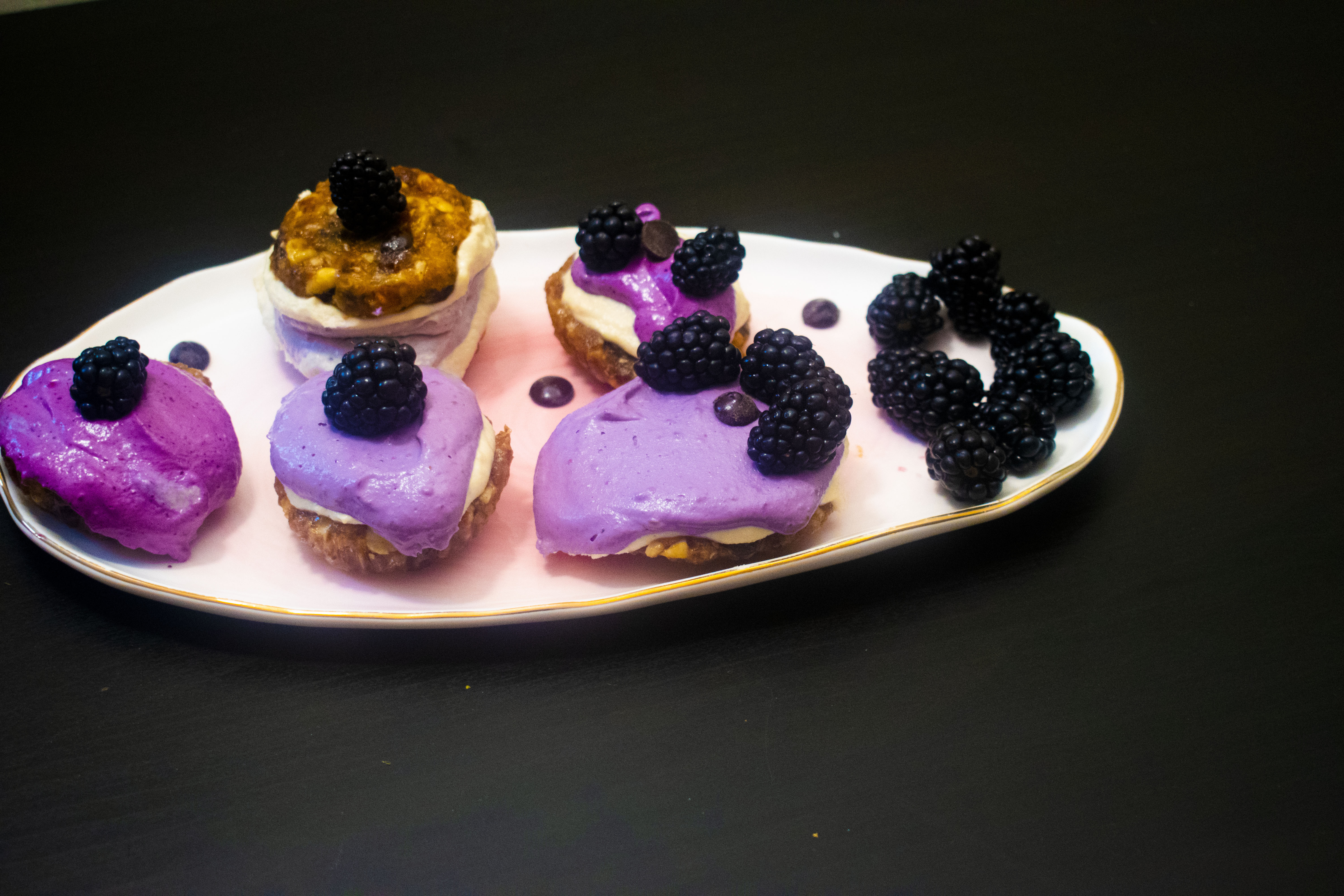 - Add Blackberries to the blender that had the blueberries and cashew layer. Blend again. Place these in the fridge to cool.