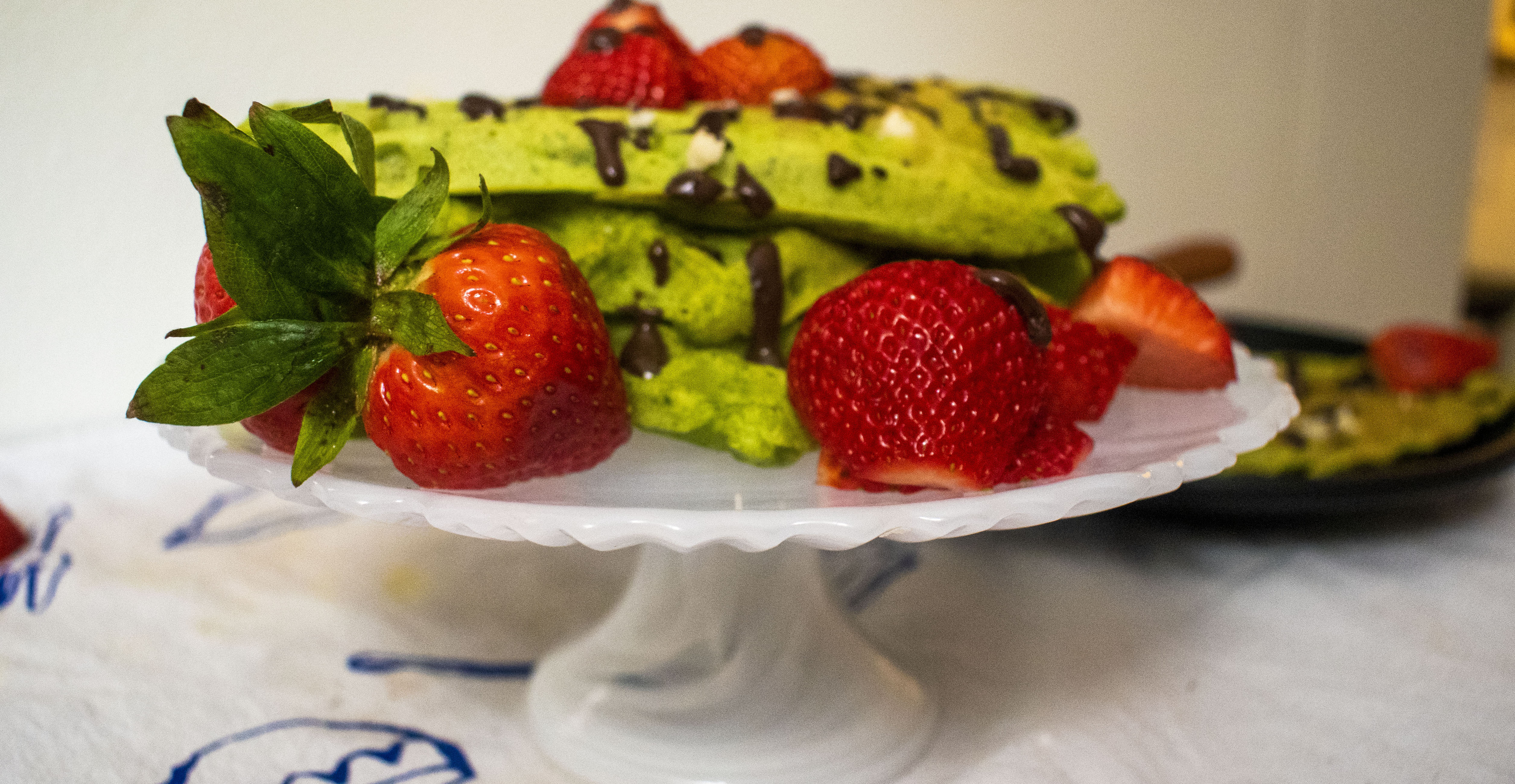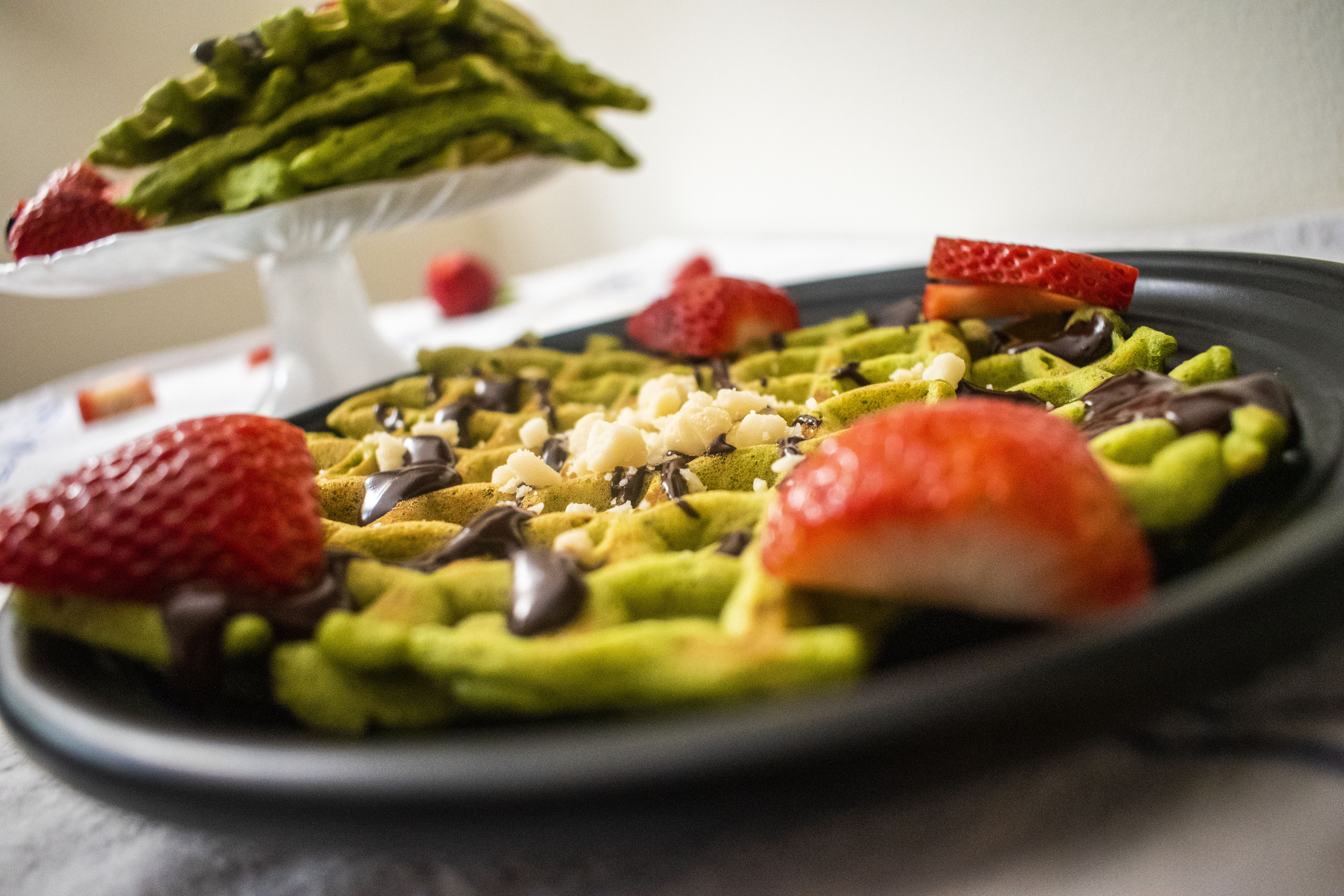 - Chop the strawberries roughly to add on top of the waffle stack.
