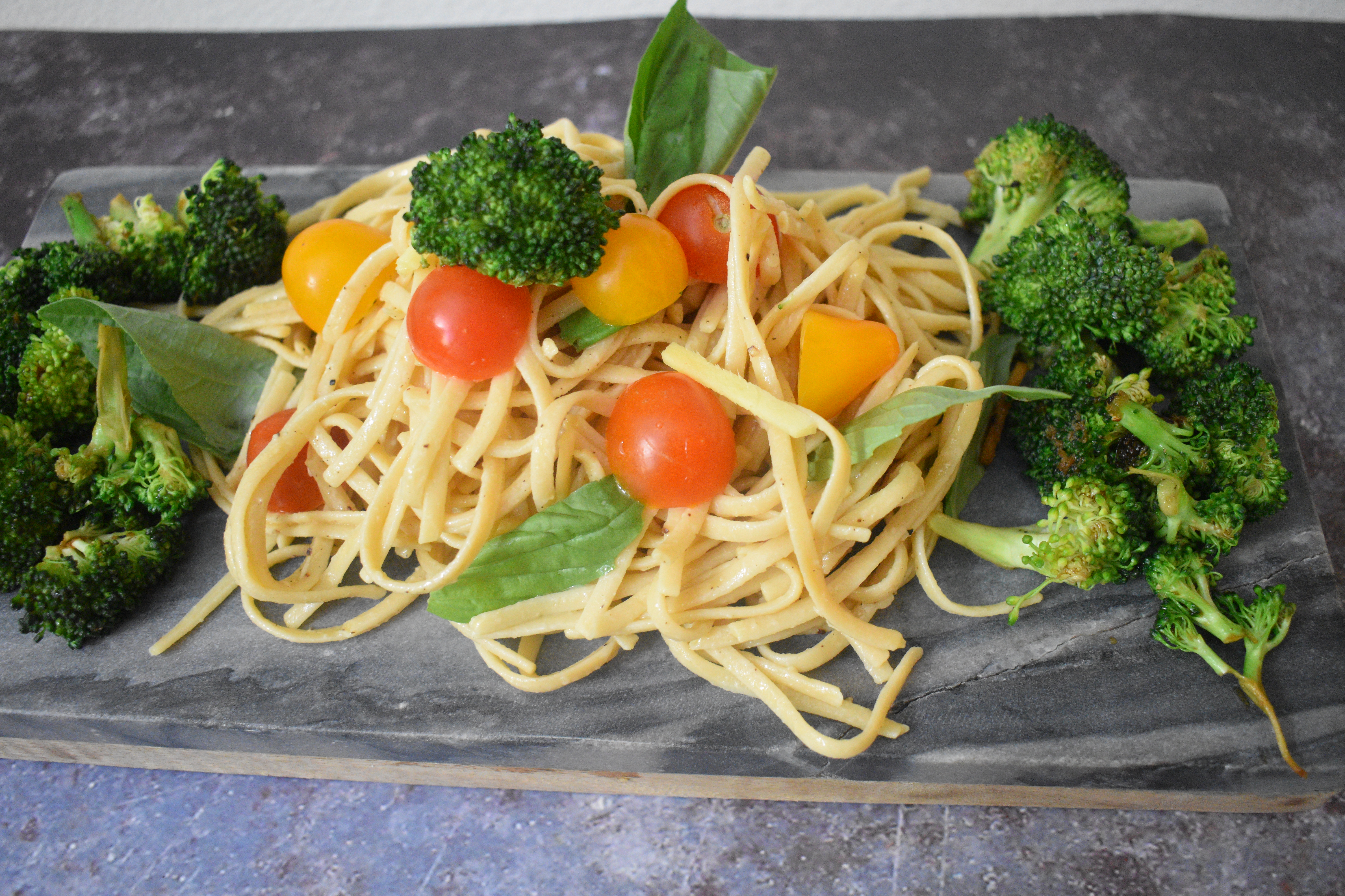 In my opinion, for any cream or oil based pasta, linguine or spaghetti do the trick like no other. I used a rustic strong cold pressed olive oil for the flavor and it was a hit! I used Banza pasta that is made from chickpea flour. What can’t we make with chickpeas?! Hummus, falafel balls, carrot cake, and awesome pancakes/chilra!