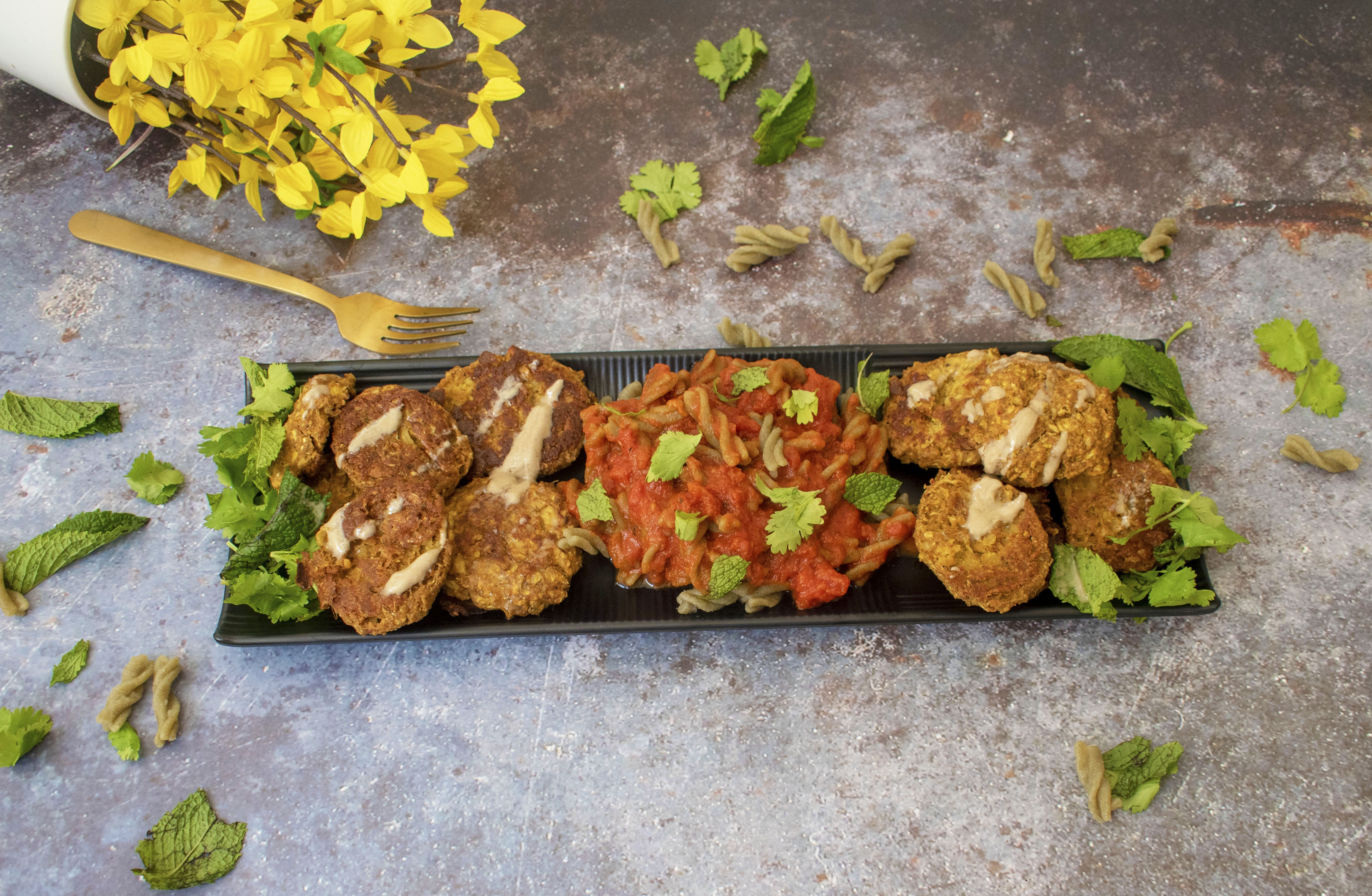 - In a bowl, pour in the pasta first and top it with these delicious veggie meatballs on top with a drizzle of tahini lemon dressing or just lemon and serve hot!