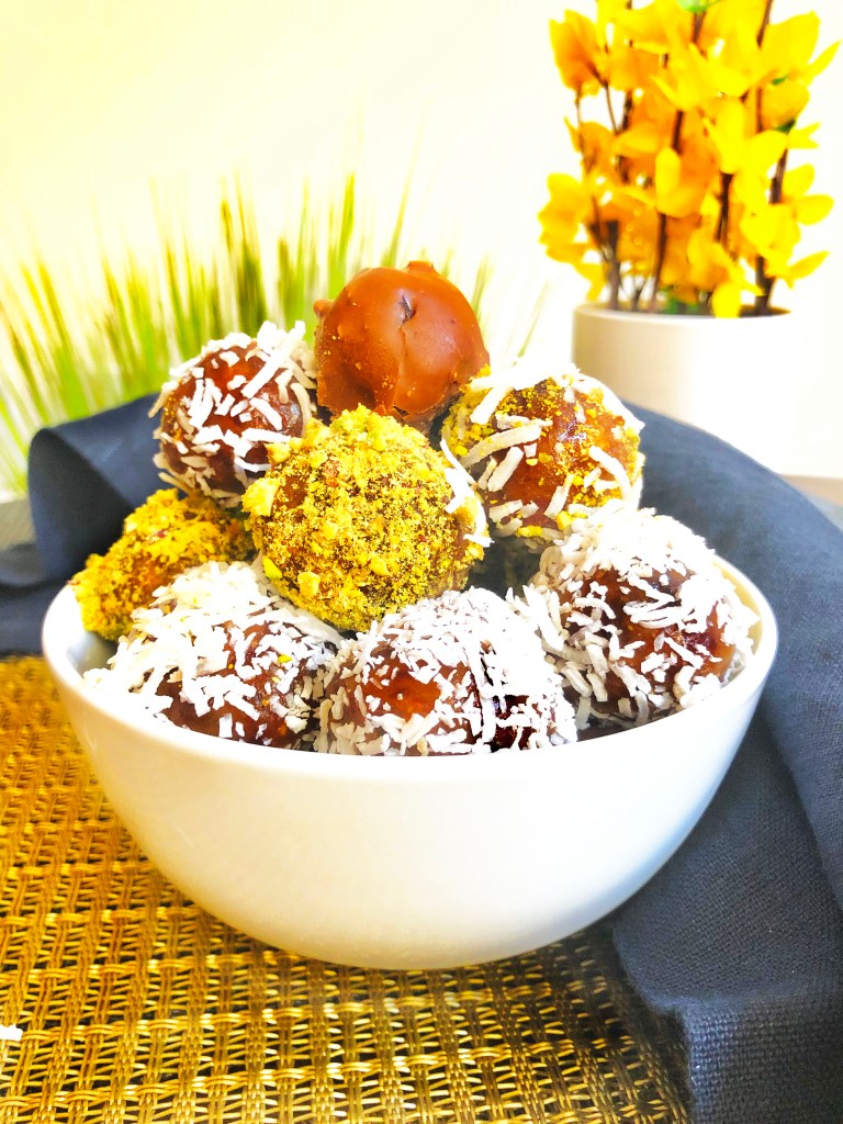 I rolled them in a cup of finely chopped pistachios and coconut flakes for something extra!!