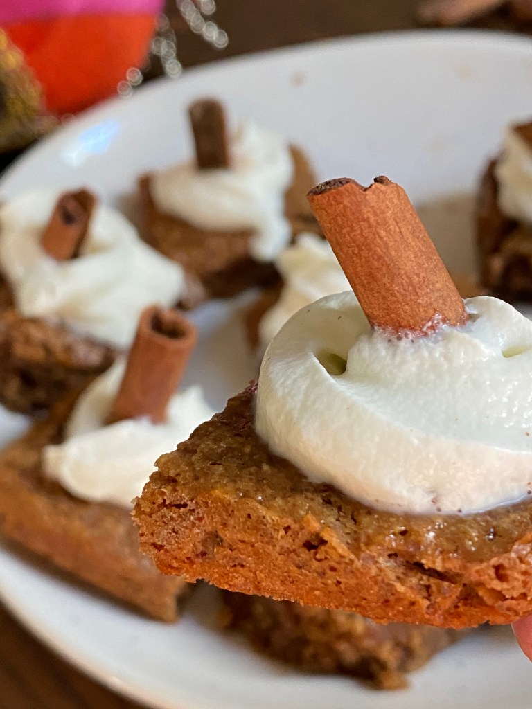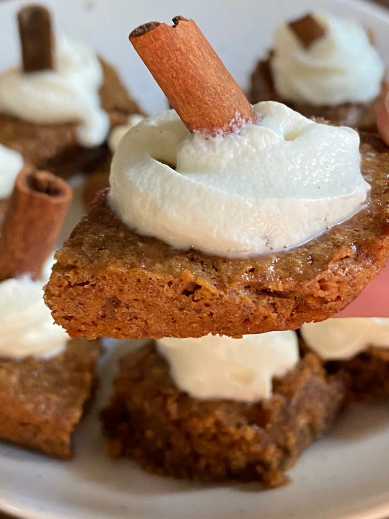 The aromas of cinnamon and nutmeg with the texture of something so moist and gooey is hands down the BEST kind of blondie to have! There’s something about winters and such gooey, aromatic and melt in your mouth kinda desserts that I or shall I say “we” can’t get enough of. Husband and I gobbled 2 of these as soon as I cut into them without the cream on top. The whipped cream could be flavored but because I had all these flavors in the blondie that I refrained from adding anything in the cream and kept it super simple.